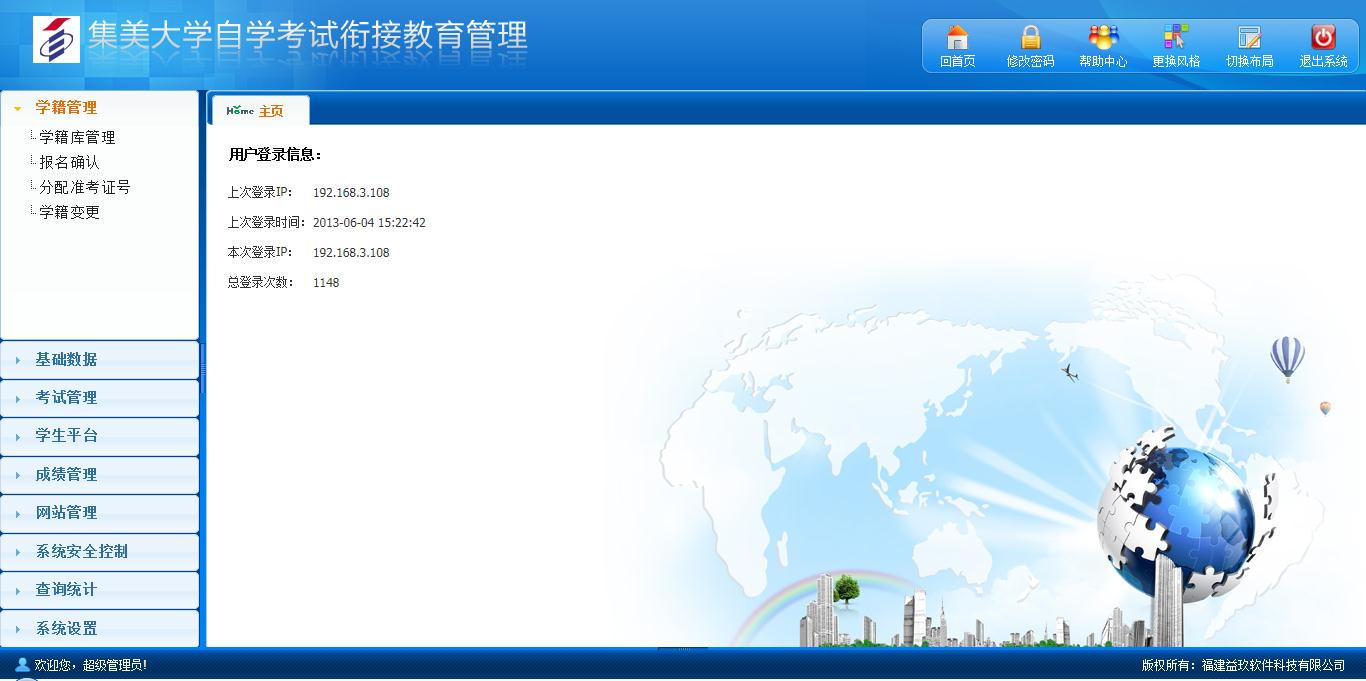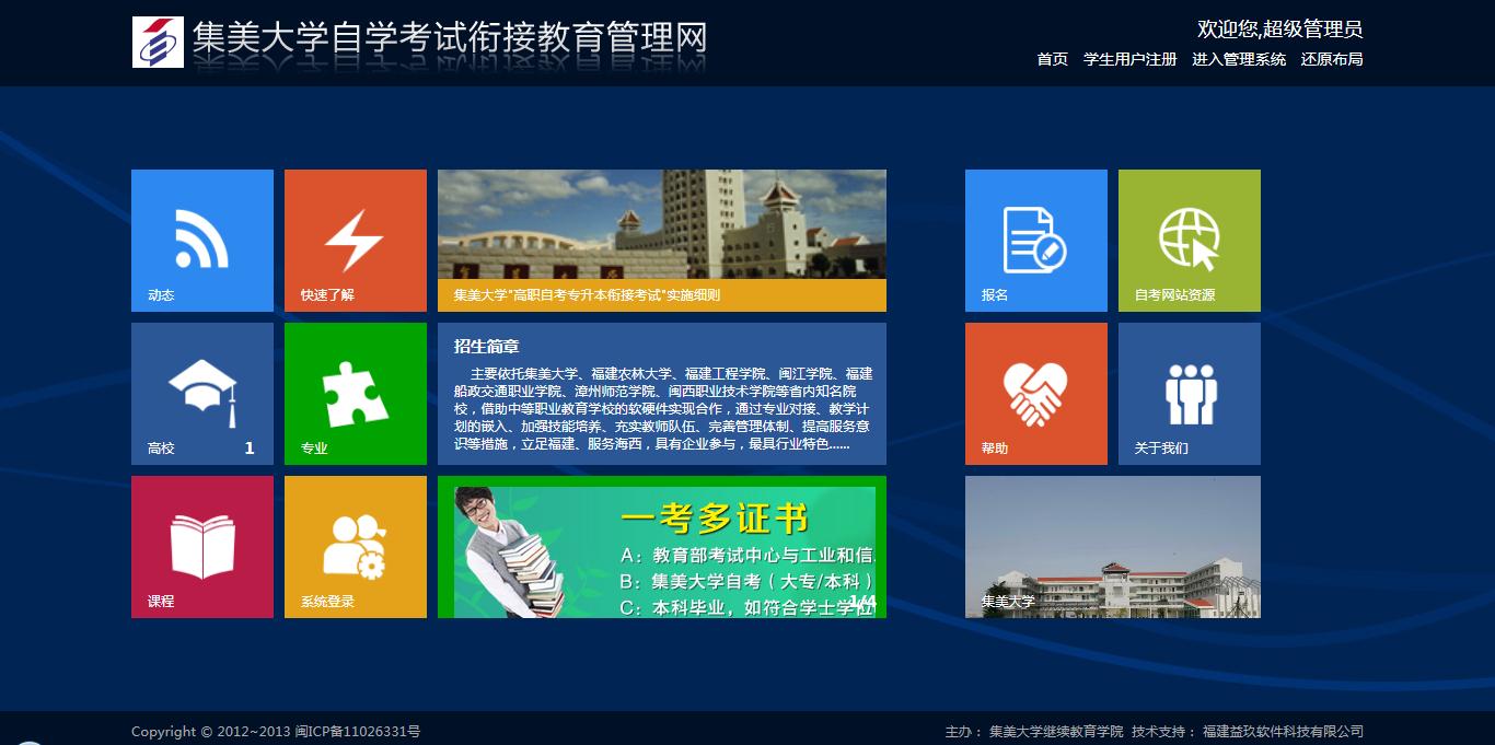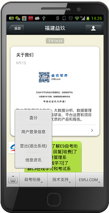 系统包括资讯网站、管理系统、手机端三个子系统组成。业务系统功能模块组包括学籍管理、基础数据、管理、平台、成绩管理、网站管理、系统安全控制、查询统计和系统设置等。在微信软件中扫描二维码图片,或查找并关注微信公众账号“福建益玖”,获取最新信息资讯,使用分数查询、问题反馈等服务。